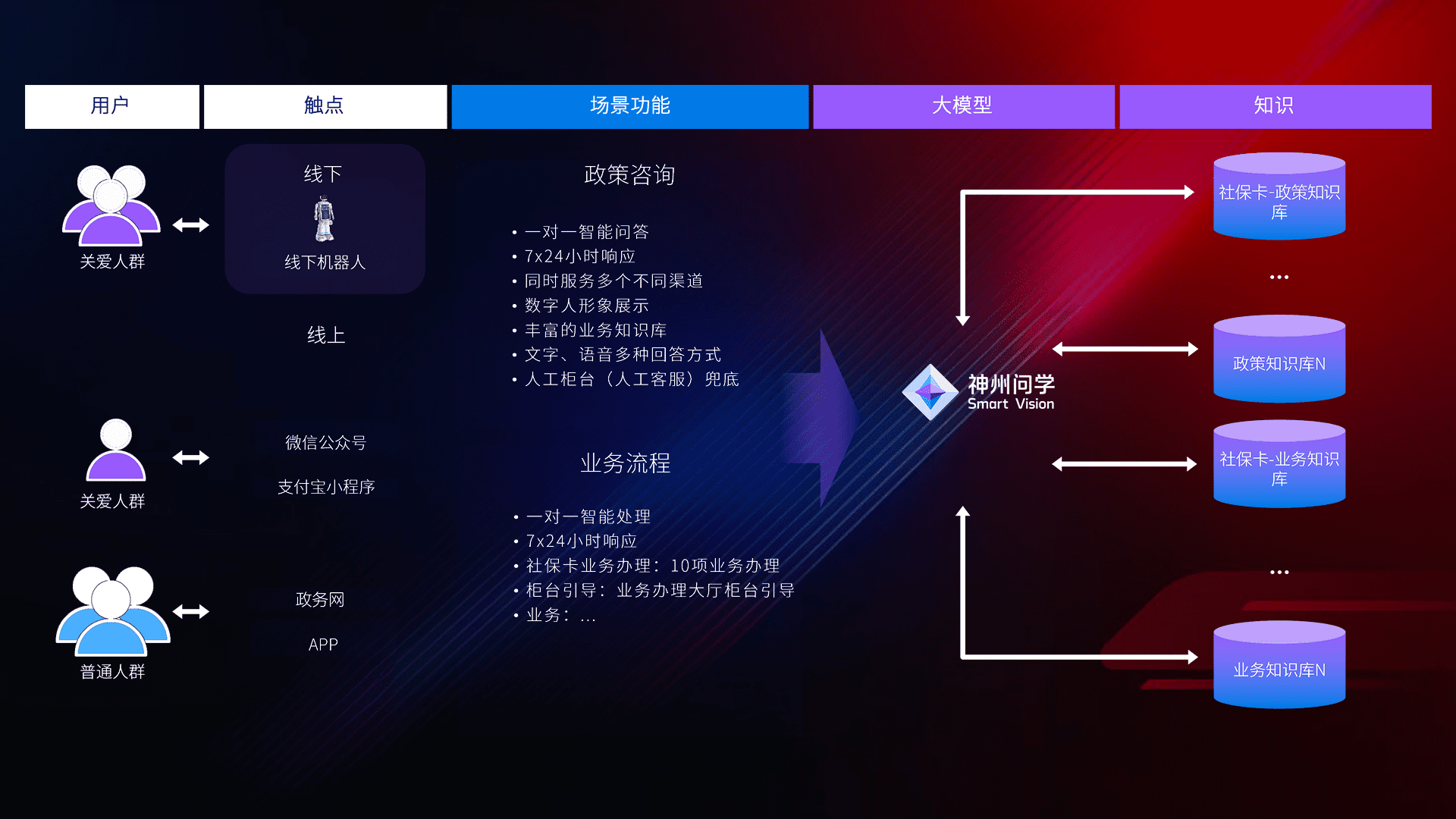 • 利用大语言模型+RAG技术,,,,支持多轮对话,,,可识别多种同义词、、、近义词,,,精准理解关爱人群语义快速输出结果。。。