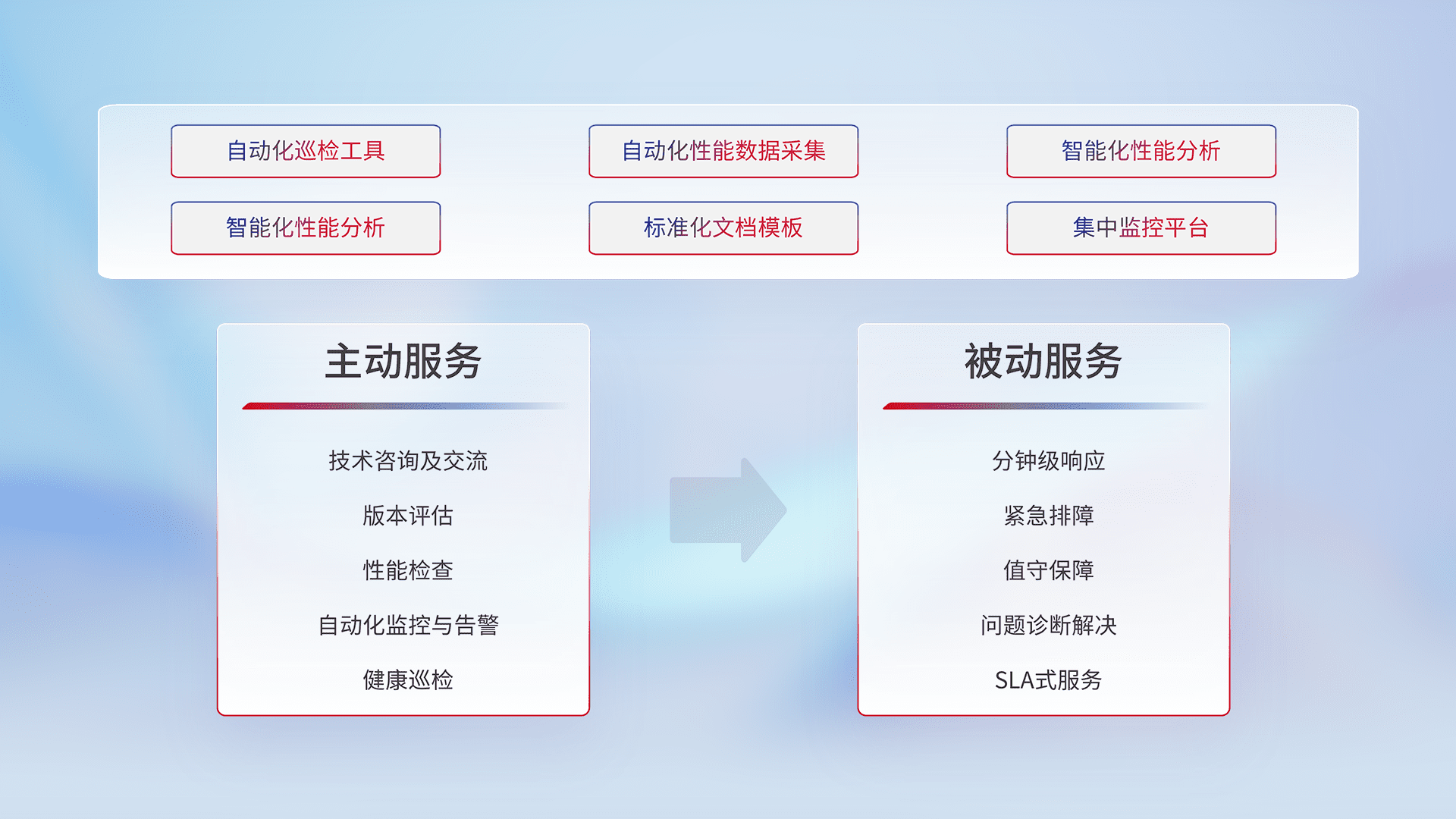 智能化工具和标准化文档,,,保障服务质量,,提供主动服务(包含技术咨询、、版本评估、、性能检查、、、自动化监控与告警、、、健康巡检)和被动服务包含(分钟级响应、、紧急排障、、、、值守保障、、、、问题诊断解决、、、SLA服务)。。